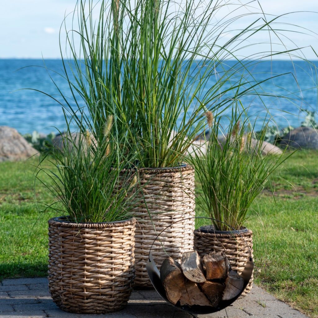 Seagrass belly baskets fit perfectly over standard pots, providing a stylish natural cover without needing repotting.