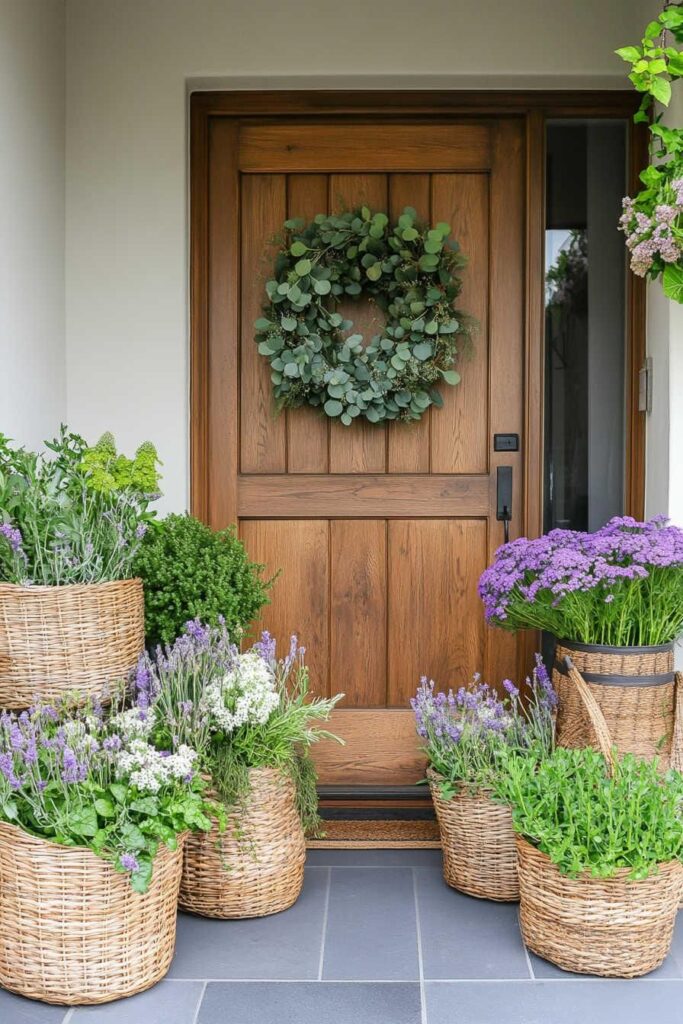 Using a pair of seagrass baskets flanking the door creates symmetry and an inviting first impression.
