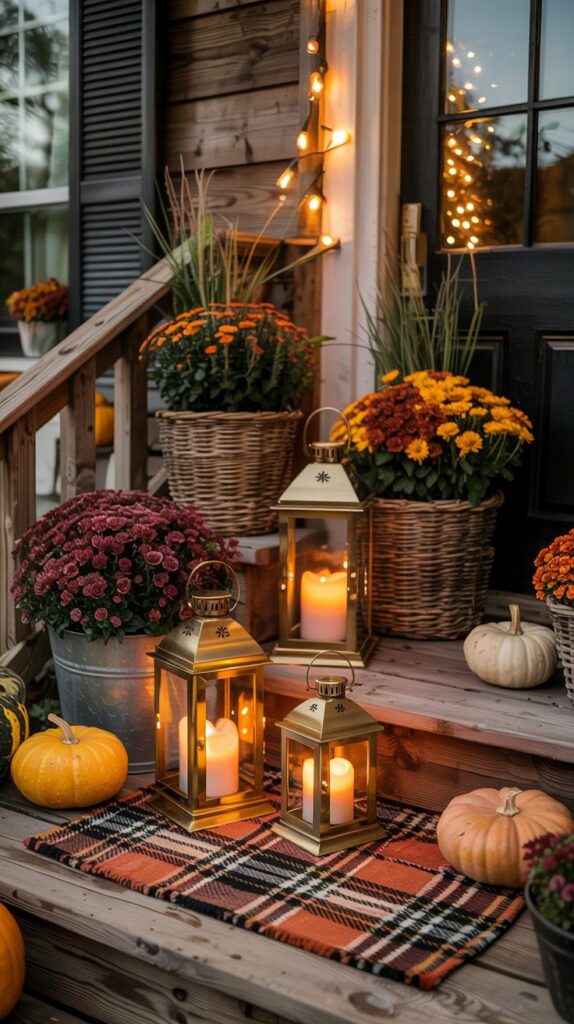Handcrafted lanterns bring soft lighting and seasonal atmosphere to fall porches.