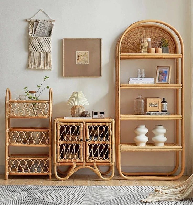 Rattan & Bamboo bookshelves, storage racks, and small cabinets perfectly complement Scandinavian neutral interiors