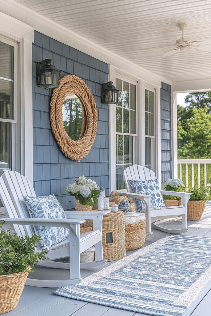 Coastal spring porch décor with blue tones combined with seagrass and rattan baskets for a relaxed seaside look