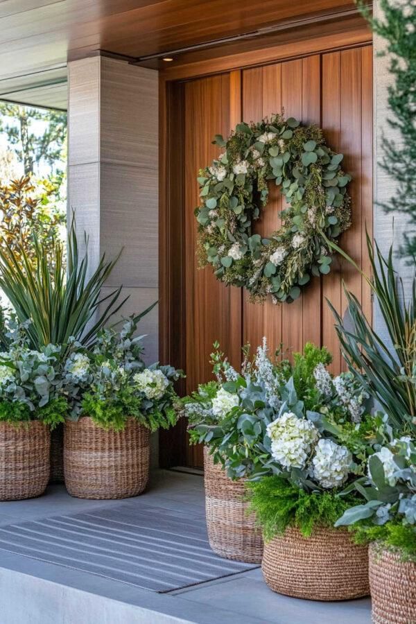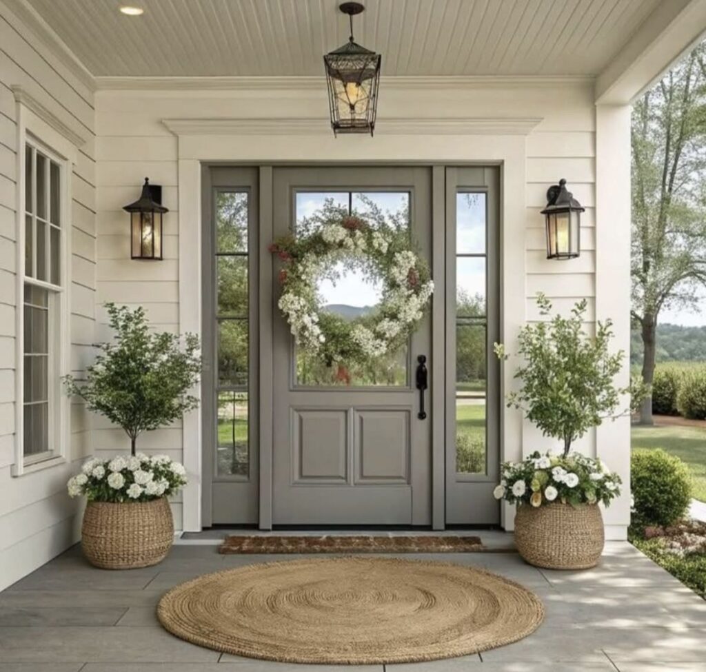 Seagrass floral baskets are a spring staple for porch displays. Their natural beige tones and clean weave structure suit minimalist and Japandi palettes while providing enough rigidity for planters and florals.