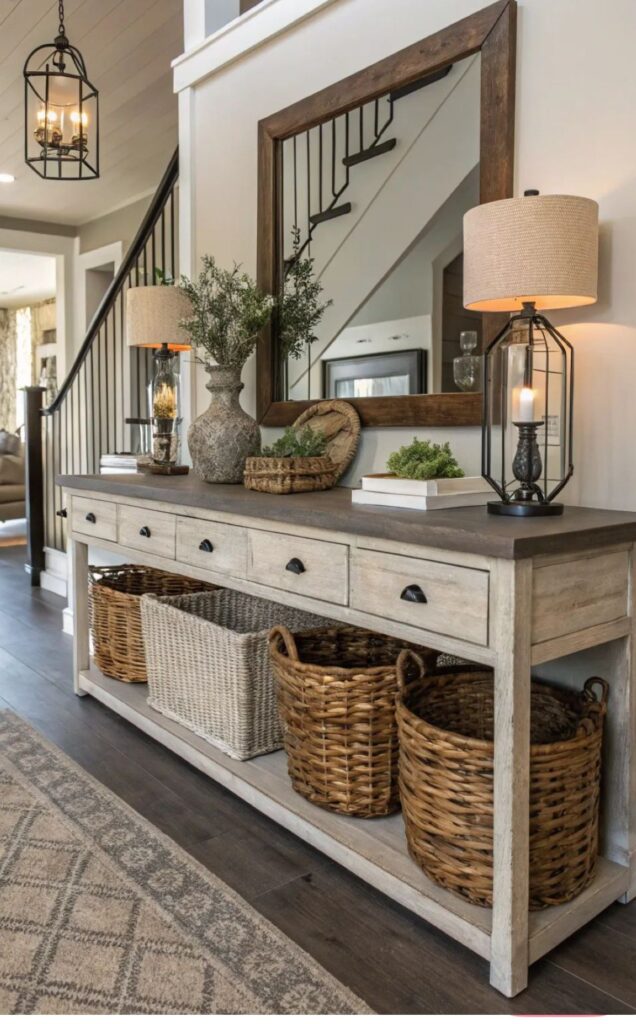 Farmhouse entryways often include mixed textures—wood, metal hooks, woven baskets.